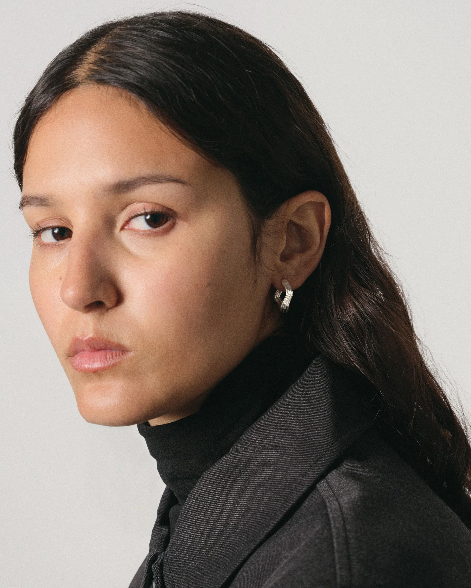 A sculptural miniature of the Simone Hoops, the Pam Hoops capture the same fluid elegance in a more understated form. With softly contoured lines and a subtly textured surface, they evoke quiet movement and refined artistry—perfectly proportioned for everyday wear.